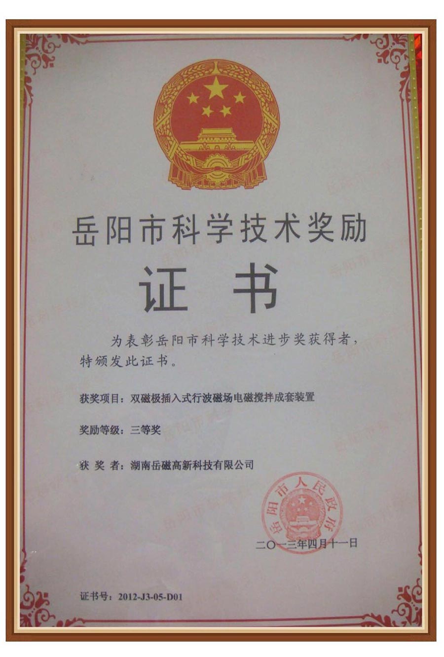 公司以具有完全知識產權“雙磁極插入式行波磁場電磁攪拌成套裝置”項目申報,經過申報資料評審,向評審專家答疑,評審組到公司現場考察等環節,榮獲2013年度岳陽市科技技術獎勵三等獎,并在全市科技創新暨科學技術獎勵大會上公布并頒發榮譽證書。